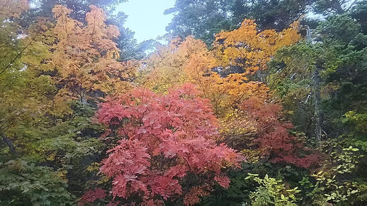 山荘から下の冷泉小屋バス停更に摩利支天バス停の間は赤も多く賑やかな色合いとなっています(写真三枚目)。この先雨風や霜などの影響がなければ良いのですが。次回は明後日10月1日木曜日の予定です。